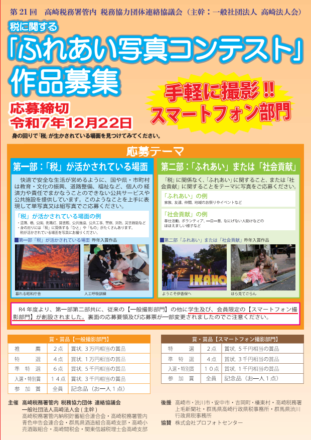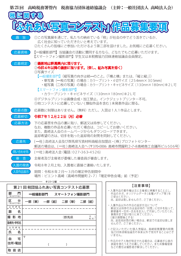 また、高崎法人会では、税の啓蒙を目的とし、税を考える週間に立看板を掲示、各地区会では、祭りへの後援、郷土環境美化運動などの社会貢献活動に取り組んでいます。毎年、「ふれあい写真コンテスト」(税務協力団体連絡協議会主催)を主管となり執り行い、多くの納税者に対し、税が社会に生きている様子、納税意識の向上と社会の健全な発展を広報しています。